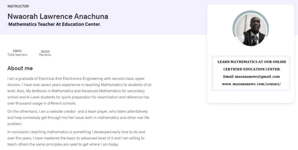 Mazananews is a center for learning and E-commerce . The Author was an award winner of Mathematical Association Of Nigeria National All Senior Secondary School Mathematical Competition (First Position, 2000) And also, he was best student of his set in Further Mathematics . He authored a textbook and Past Questions in Further Mathematics (4000 copies sold in less than a year) for Senior Secondary School Students, A-level, O-level and anyone willing to broadening his or her knowledge in this area of study. A graduate of Electrical And Electronics Engineering. Also, he has deep experience in Marketing.